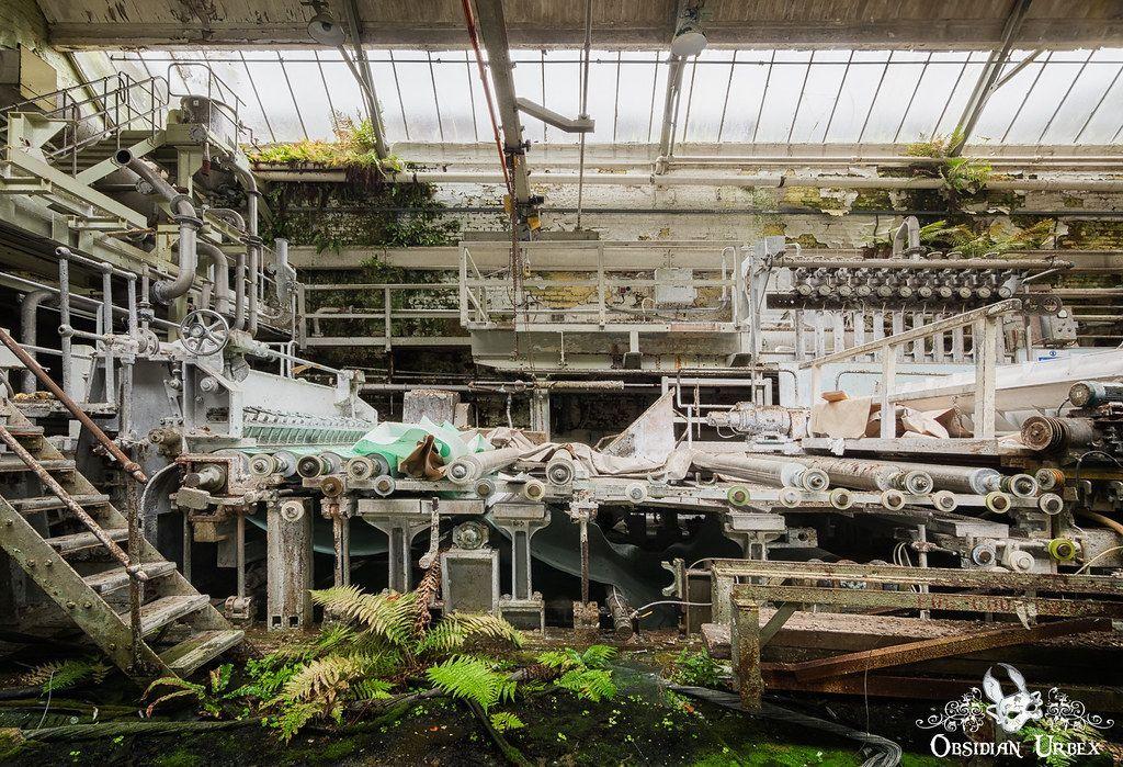 Machines called Bertrams Beaters line this long hall. These pale blue and beige machines would macerate and break up the pulp fibres. Inside the now demolished Robert Fletcher & Sons Paper Mill, England.