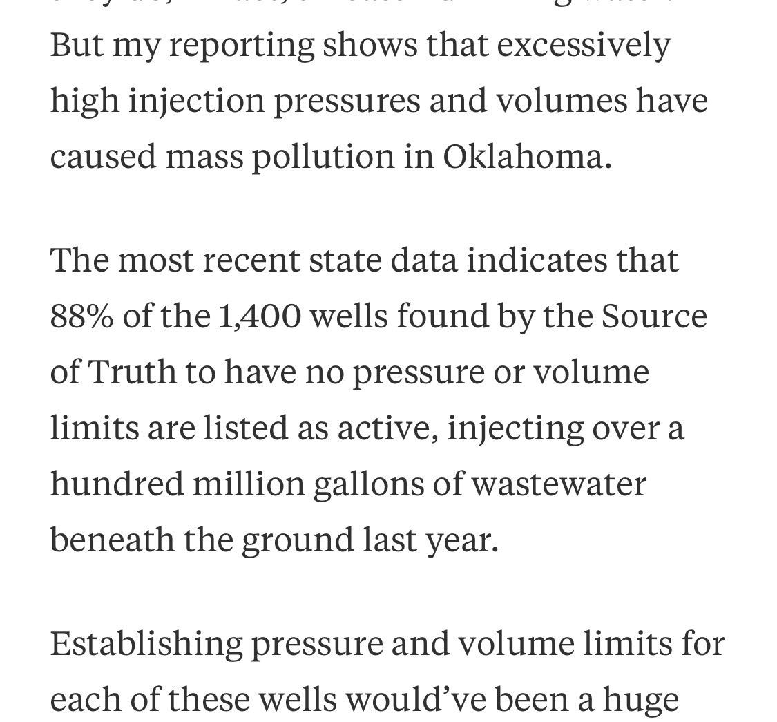 But my reporting shows that excessively high injection pressures and volumes have caused mass pollution in Oklahoma. The most recent state data indicates that 88% of the 1,400 wells found by the Source of Truth to have no pressure or volume limits are listed as active, injecting over a hundred million gallons of wastewater beneath the ground last year. Establishing pressure and volume limits for each of these wells would've been a huge